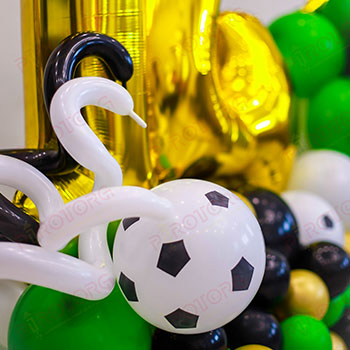 Золотые цифры, фигура "кубок"; Декор: спирали из ШДМ, шары футбольный мяч; Подставка из разнокалиберных шаров с воздухом, цвета: черный, зеленый, белый, золото; Высота композиции 135см.