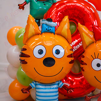 Ходячие фигуры “Три кота”; Красная цифра с индивидуальной надписью; Декор: надпись “миу-миу” на подставке и цифре; Подставка из разнокалиберных шаров с воздухом, цвета: латте, оранжевый, оливковый; Высота композиции 140см.