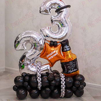 Серебряные цифры, фигура "бутылка виски", оранжевая звезда с индивидуальной надписью. Декор: серебряная цепь из ШДМ, черный ободок из ШДМ. Подставка из разнокалиберных шаров с воздухом, цвета: черный. Высота композиции 165 см.