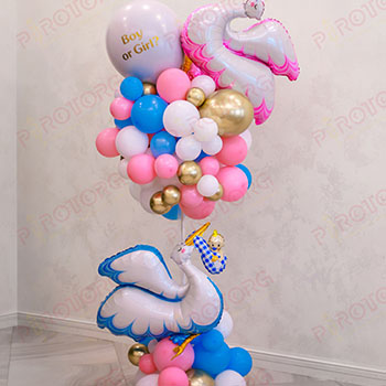 Pop-me шар с маленькими шарами внутри; Два фольгированных аиста; Цветовая палитра дерева из разнокалиберных шаров с воздухом: белый, розовый, голубой, золото; Высота 230 см.