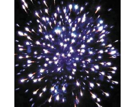 1. Сине-белая мерцающая сфера (пион). 2. Фиолетово-белая мерцающая сфера (пион). 3. Красные звезды с пышными хвостами (кокос) и треск. 4. Зеленые звезды с пышными хвостами (кокос) и треск. 5. Красочная концовка. ЗАЛП: Облако треска (трещащая хризантема).
