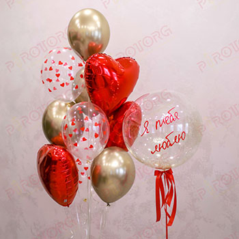 Фонтан из 10 шаров: золото хром, кристалл с сердцами, красные сердца + Баблс с золотыми блестками и надписью "Я тебя люблю".